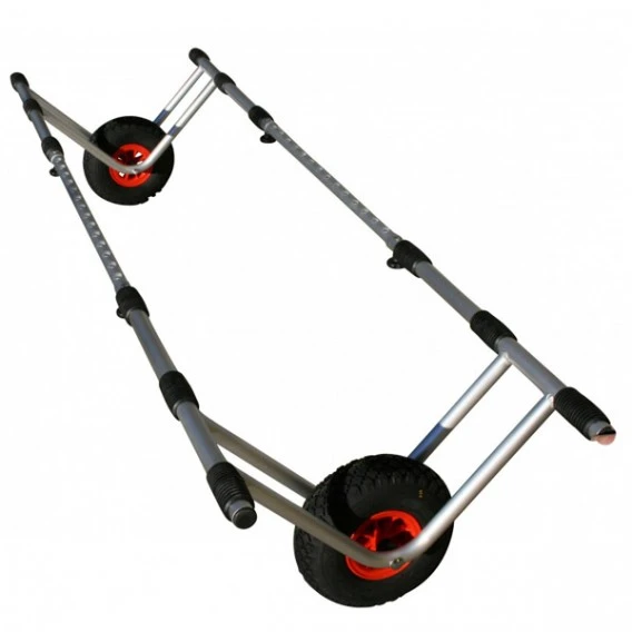 Mit verstellbarem Radstand. Geeignet für Boote mit flachem Boden. Achsenbreite verstellbar von 140cm bis 210cm. Klein zusammenlegbares Alugestell eloxiert mit Luftrad 400mm inclusive Zurrgurt.
