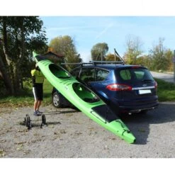Der geniale Daytourer S hat ein schmales Grundgerüst und kleine Räder. Er wird im hinteren Teil des Bootes befestigt. Dank des einfachen Funktionsprinzips können die beiden Räder mittels Druckknopf einfach demontiert werden. Das kleine Packmaß ermöglicht den Transport des Wagens an Deck des Kajaks oder in nahezu jeder Ladeluke des Bootes.